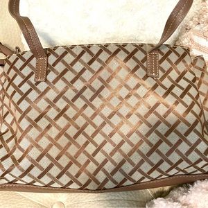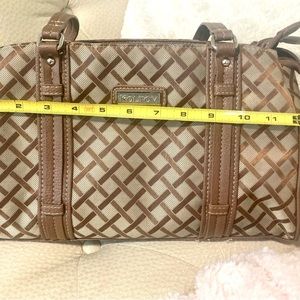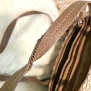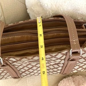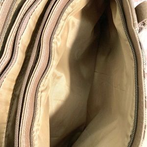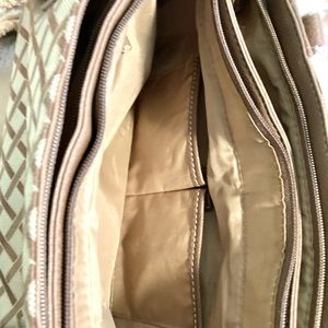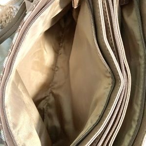 Main bag in great shape, interior has 3 separate sections with inside zippered pockets and is clean as a whistle. Handles do show moderate wear. Beige and brown in color.