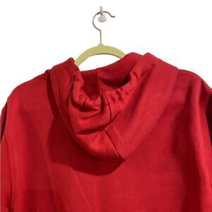 Medium red and white hooded pullover hoodie by L’auberge in excellent preowned condition.
