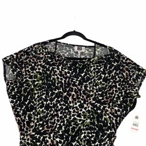 Laundry by Design blouson dress, women's size 10, in a bold green, black, white, and tan leopard print. Features chic cut-out sleeves and a flattering silhouette.
