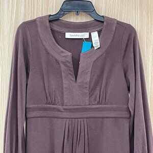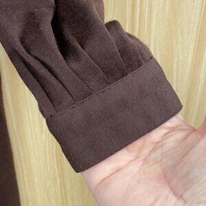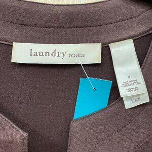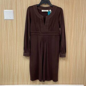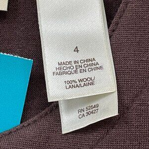 100% wool dress is pleated in the front at the waist and has a cutout v-neck. It is in excellent condition with no rips or stains.