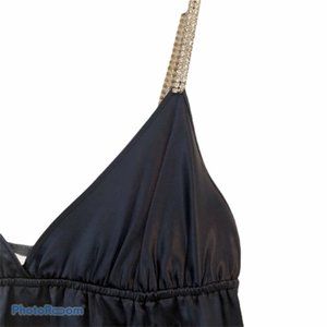 Laundry by design Navy Silk and Rhinestone strap Slip Dress Size M. 100% silk in beautiful Navy color. Elastic under V-neck Bodice has a lot of stretch for comfort and fit. Sparkly rhinestone straps for extra detail. Pull on style. Pet friendly and smoke free home.