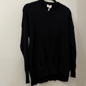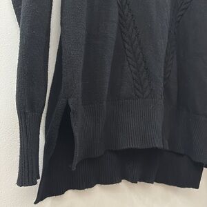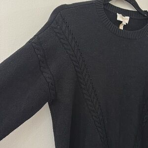 Chic black sweater with cable knit details. Crew neck design. Versatile and stylish.