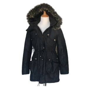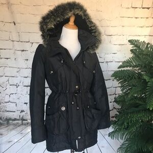 Laundry By Shelli Segal Black Fox Fur Trim hooded Parka Jacket Coat size small