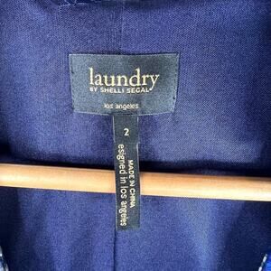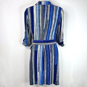 Laundry by Shelli Segal blue and white multi pattern faux wrap style dress with metal rivet/faux snap detail, collar, plunging neckline, and adjustable snap sleeves. Size 2 or extra small. There is a small side zipper but as a 2-4 dress size I could not comfortable get this dress on so definitely best for an extra small IMO.