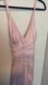Chic blush maxi dress with intricate lace overlay. Features a flattering V-neckline and elegant silhouette. Perfect for formal occasions.