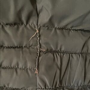 Stylish charcoal puffer jacket with a warm hood. Features sleek quilted pattern and convenient zippered pockets. Perfect for chilly days. One hole on back sewn by yours truly (last picture).