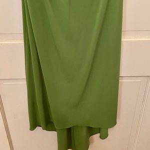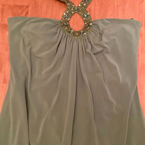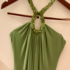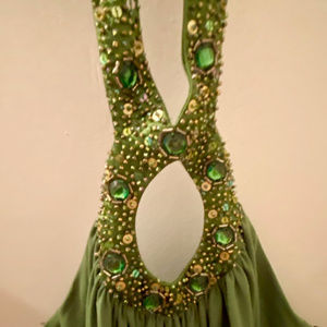 This was only worn once and is in excellent condition. It's a green halter dress with a beautiful beaded embellishment around the neck.