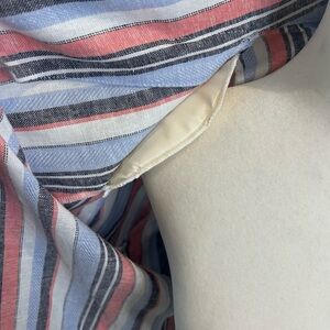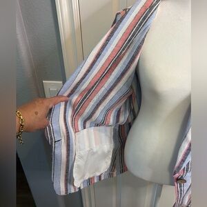 Chic with multicolor stripes. Ruched sleeves and one button front closure and 2 functional front pockets. Comes with shoulder pads, but they can be easily removed if not wanted. Comes with an extra button.
