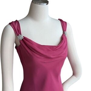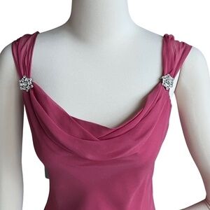 Laundry By Shelli Segal Pink Silk Drape Front Dress With Crystal Detail At Straps And Asymmetrical Hem Size 10 NWT. New flawless unworn/unused condition. A strappy, open back adds a smoldering touch to this gorgeous 100% silk cocktail dress adorned by crystal details at the straps, an elegant drape neck, and chic asymmetrical hem. Bring some drama and glamour to your next special occasion with this striking cocktail dress that will have all eyes on you.