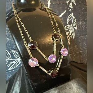 This exquisite necklace from Laundry By Shelli Segal showcases a harmonious blend of gold and purple hues, crafted with a delicate pendant design. The polished finish and intricate detailing of the large different hues of Purple gems and crystals make it a captivating addition to any jewelry collection, perfect for elevating your style with a touch of sophistication.