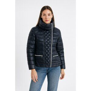 Stay warm and stylish with this quilted navy jacket from Laundry by Shelli Segal. Featuring a cozy down filling, it offers lightweight warmth and a fashionable look. The asymmetrical zipper and zippered pockets add modern functionality, making it an excellent choice for cold-weather outings.