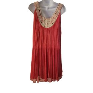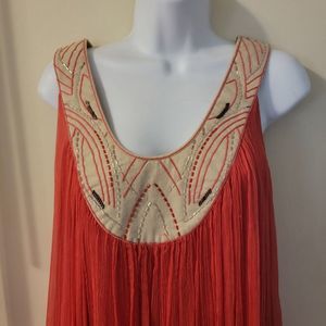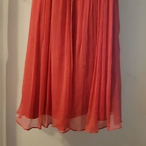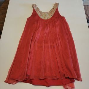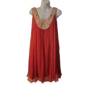 Stunning, flowy, and sleeveless, this vibrant orange dress by Laundry by design is perfect for the warm summer months. Featuring detail beading at the neckline and 100% Silk!