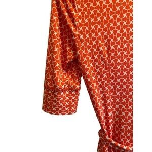 Laundry by Shelli Segal. Beautiful Orange Geometric Pattern Button Down Dress w/ Tie. Excellent used condition. 3/4 length sleeves with sweet detailing, see photos. Collared deep v-neckline. This dress is so gorgeous. The orange and white pattern pops. This fabric is so good and it really moves with you. This dress feels well made and high end.