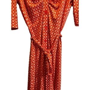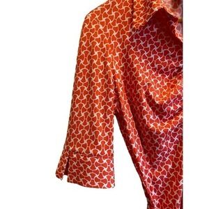 Laundry by Shelli Segal. Beautiful Orange Geometric Pattern Button Down Dress w/ Tie. Excellent used condition. 3/4 length sleeves with sweet detailing, see photos. Collared deep v-neckline. This dress is so gorgeous. The orange and white pattern pops. This fabric is so good and it really moves with you. This dress feels well made and high end.