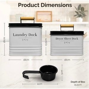 Storage Containers Set: The storage bins with lids set contain 1* laundry pod holder, 1* dryer sheet holder, and 1* scoop. The storage containers with lids are printed with a dock at the front side