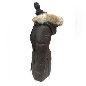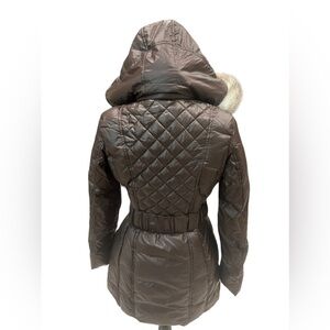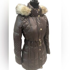Laundry by Design puffer jacket in bronze with gold accents. Features a warm hood and belted waist. Excellent condition.
