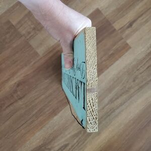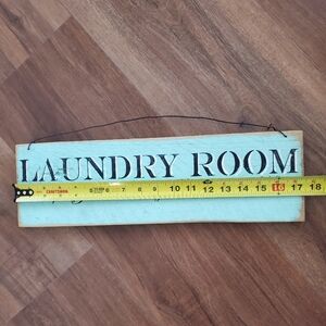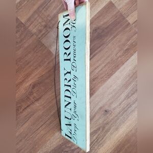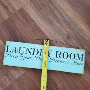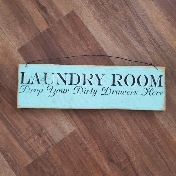 Homemade wood sign with the words, 'Laundry Room Drop Your Dirty Drawers Here' in black & white paint on a distressed, sea green painted background. Has attached metal hanger. Perfect addition for your laundry decor!
