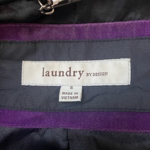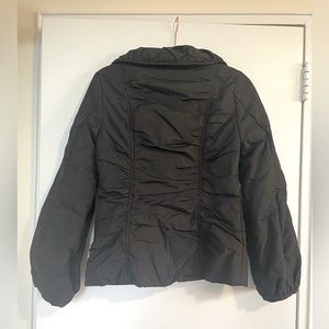 Laundry Ruched Puffer Coat in black featuring balloon sleeves, collar, silver hardware and two front pockets.