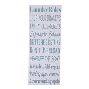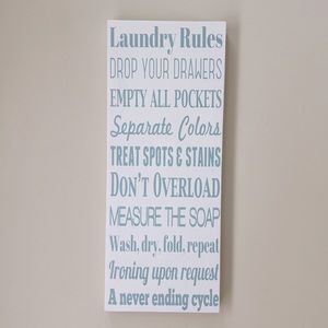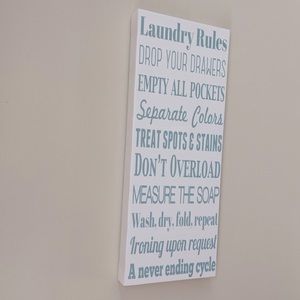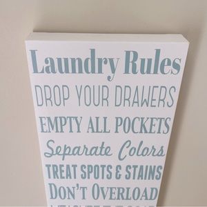 Cute Laundry Rules wall art sign in a spa, blue and just off-white color. It has hung in my laundry room for a while and now I am ready to pass it along. Comes from a clean, smoke-free home. Very good gently loved condition and ready to hang on the wall.