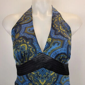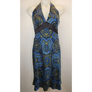 Laundry Shelli Segal 100% Silk Y2K V-neck Midi Halter Dress Blue Gold Regal 6