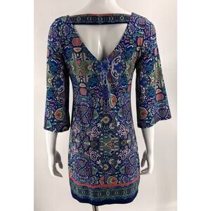 Laundry Shelli Segal Dress Size XS Blue Green Colorful Bell Sleeve Cutout Back