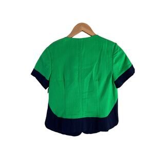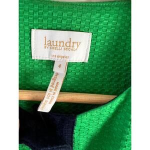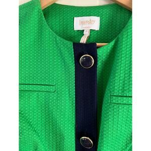 New Laundry Shelli Segal preppy kelly green and navy blue short sleeve lady jacket, size 4. Pretty feminine cut, rounded hem, button front, collarless, textured fabric (cotton spandex blend), partial lining