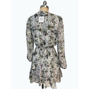 Be the breath of fresh air to covet in this stunningly made Laundry HU07D29 creation. Beautifully designed with a tailored lining and overlaid with sheer floral print chiffon, this beauty charms with a v-neckline and styled with a surplice bodice. Flaunting sheer bishop sleeves, a full back and nipped with a garterized band along the waist, the tier ornate skirt flutters into an A-line silhouette with a mini hemline. Make a lasting impression from every angle in this stylishly made Laundry masterpiece. Model is wearing the Full Bloom color.