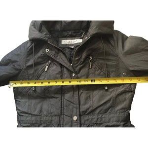 This listing is for a preowned Laundry by Shelli Segal pale green coat with adjustable collar in women's size XS. There are zipped pockets, adjustable drawstrings in the collar, waist, and sleeves, a slit in the back for movement, and on the inside there is a quilted lining and flap closure pocket. The exterior is made of nylon, polyester, and metal, according to the tag, which probably refers to the hardware. It measures about 18" across the chest, about 15" across the waist, about 22" across the bottom, about 29" long from the shoulder to the bottom edge, and the sleeve is about 24.5" long from the shoulder to the edge, all laying flat. It appears to be in good preowned condition with minimal signs of wear.