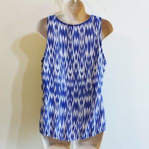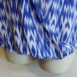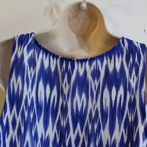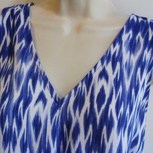This sleeveless blouse is lightweight and airy. The fabric is sheer and silky feeling. It is shades of blue and white. It has a v-neck with a mock wrap front. The bottom hem has thin elastic. It's a gorgeous top and is in near to new condition.