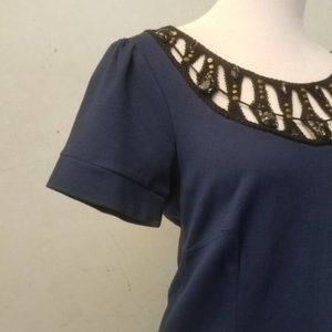 in perfect condition, Laundry Shelli Segal navy short sleeve dress with beading and embroidery lace detailed neckline.