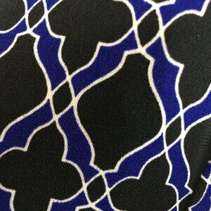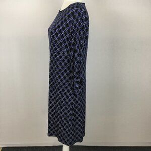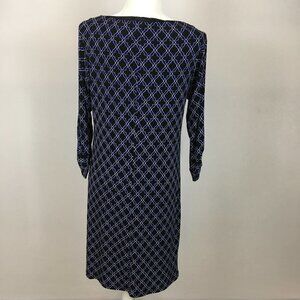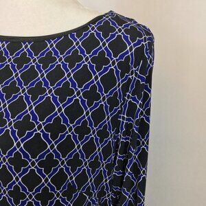Laundry Shelly Segal Stretch Jersey Midi Dress Boat Neck Roll Tab Sleeve Lined Polyester Spandex Black Blue Geometric