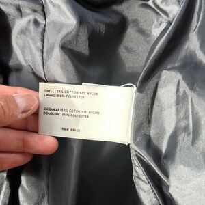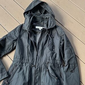 Sleek black jacket with a hood. Features a stylish design. Ideal for everyday wear.