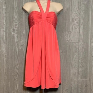 Laundry by Design Coral Stretch Halter Dress 2 NWT $195. Boning at bodice. Side zipper and hook and eye closures. Adjustable strap at back neck with hook and eye closures.