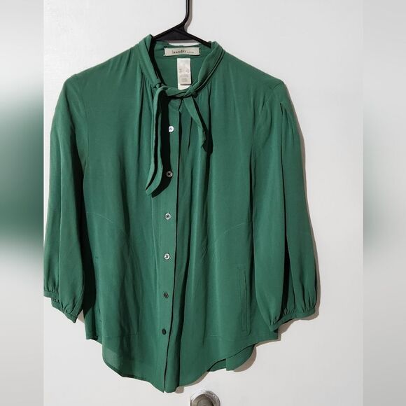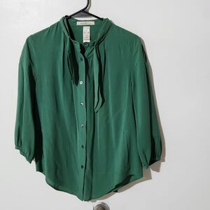 Elegant green blouse with button front. Features a stylish tie-neck design. Perfect for any occasion.
