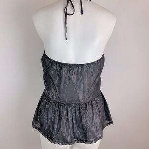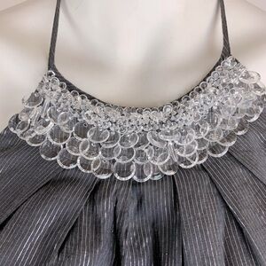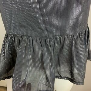 Silver Metallic Strip with tie neck. Ruffle bottom.