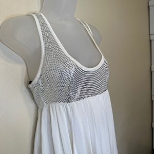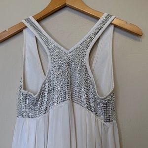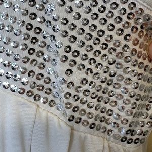 Laundry by Shelli Segal Los Angeles Pearl Cloud Dancer Pantone Color 2026 Embellished Sparkly Sequin Plunging Oval Neckline Empire Waist Pleated Stretchy Soft Lined Skirt Side Zip Eye Hook Closure Tank Top Racer Back Holiday Party Valentine’s Day Coquette Cosplay Romantic Feminine Babydoll Mini Dress