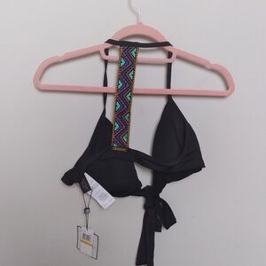 Laundry by Shelli Segal Black Aztec Oasis Wrap Bikini Top with padd8ng for support and adjustable wrap tie closure and Aztec print embroidered accents on the back