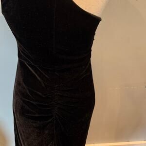 Laundry by Shelli Segal One Shoulder Black Velvet Dress, Size 10. This elegant, pre-owned black velvet dress is perfect for formal occasions or a night out. It features a sophisticated one-shoulder design and ruched detailing on the side, creating a flattering silhouette. Made from soft velvet fabric, it offers both comfort and style. Excellent pre-owned condition, with no visible flaws.