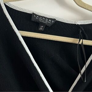 Elegant black ribbed sweater by Laundry by Shelli Segal. Features a contrasting white trim. With tie in front. Crop style.