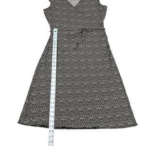 This A-line fit and flare dress is perfect for any occasion, whether it's for workwear, party/cocktail, or business. The dress is dry clean only and comes in size 12. The geometric pattern, bow accents, and short dress length make it a fashionable and chic choice for the summer, spring, or fall seasons.