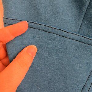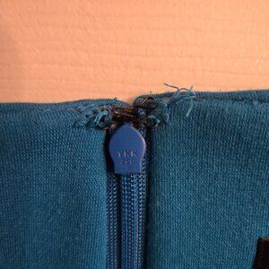 Gorgeous dress. Works for the office or cocktails. The hook closure in back could stand to be reinforced. Does have 2 thread pulls, one in back and one in front. See pics for example.