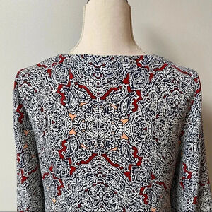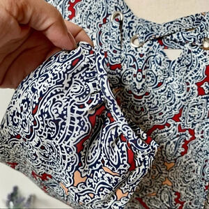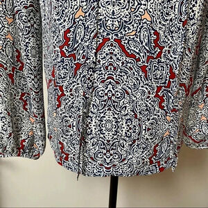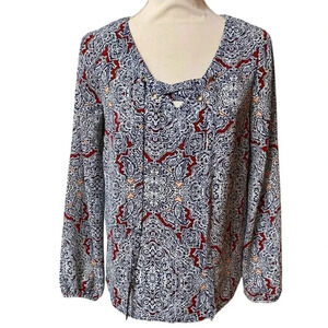 Burgundy print blouse, Laundry by Shelli Segal, lace-up blouse, women’s XS blouse, fall transitional top, career office blouse, boho chic top, feminine printed blouse, business casual blouse, burgundy navy blouse, classic workwear blouse, chic everyday blouse, layering blouse fall, versatile Shelli Segal top, easy transitional blouse