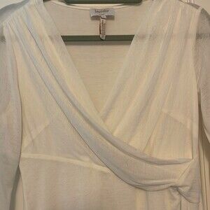 New without tag. Beautiful blouse- lined in front. Never worn. When taking pictures- I saw some light spots on the back. Not sure what it is. Just been hanging in the closet. It might have came that way and didn’t notice. The back and sleeves are pretty sheer and I don’t think you could see it on. Price reflects the defects.
