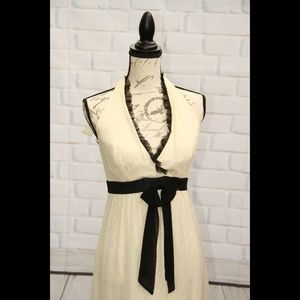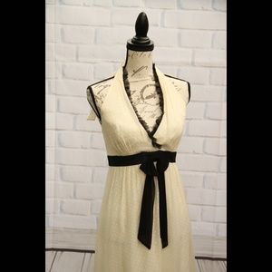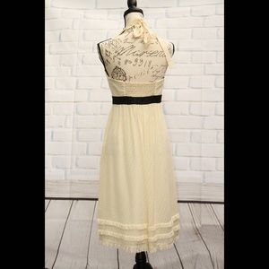 Elegant midi style dress with halter neck. NWT. Polka dot cream dress with contrasting black bow and black trim. Size 6