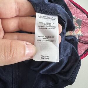 Features a bold geometric print in navy blue, pink, red, and off-white