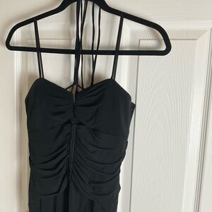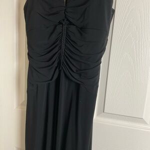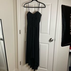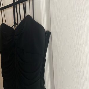 Chic black dress with ruched detailing and spaghetti straps and halter high low dress side zipper. Perfect for any occasion.