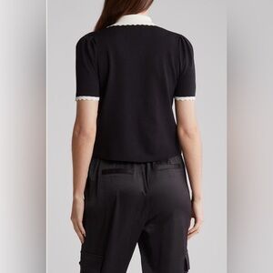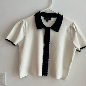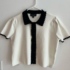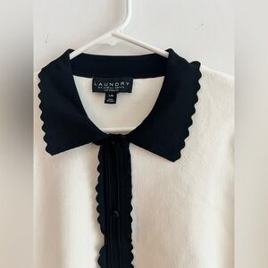 elegant knit top from Laundry by Shelli Segal, size Large. Featuring a classic ivory body with contrasting black scalloped trim on the collar, button placket, and sleeve cuffs. The short sleeves have a subtle puff design for a feminine touch. Button-down front adds timeless charm. Perfect for work, casual wear, or dressing up with tailored trousers or a skirt.