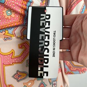 3/4 length sleeves. Side wrap tie closure. Geo printed side. Solid side. Reversible.