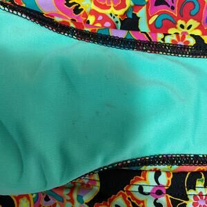 Multi-color black, green, pink, and yellow paisley print one piece swimsuit. V-neckline, sleeveless, allover print. Lined.
