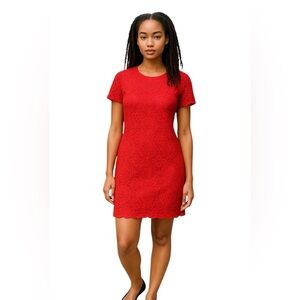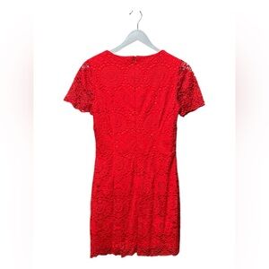 Bold red lace mini dress with short sleeves, intricate lace overlay, full lining, and a hidden back zipper. Fitted silhouette—ideal for weddings, parties, or evenings out. Excellent condition, no flaws.
